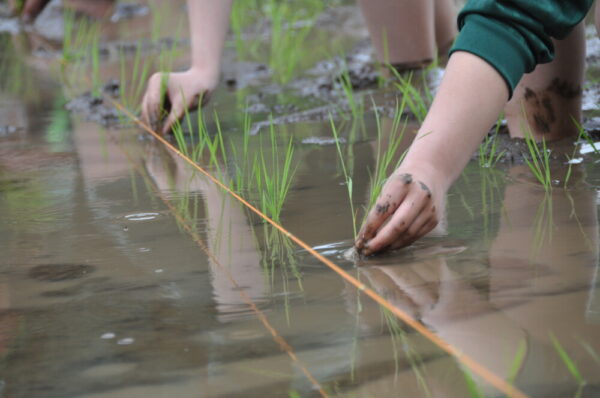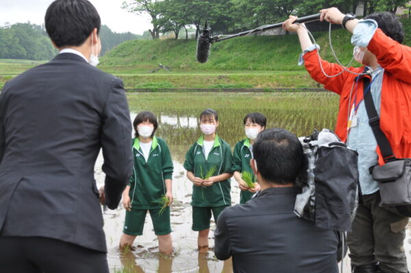 開校以来、行われている伝統行事で、あいにくの空模様でしたが、田植えを行うことが出来ました。