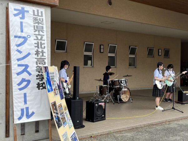 山梨県立北杜高等学校 > 部活動 > 軽音楽 > 軽音楽部 オープンスクールライブ 2023年7月4日カテゴリー: 部活動 軽音楽 軽音楽部 オープンスクールライブ 7月1日(土)にオープンスクールが実施され、軽音楽部も部活動紹介としてライブを実施しました。 当日は天候が不安視されましたが、ライブの時は晴れ間も見え、多くの中学生や保護者の方に見て頂くことができました。 ありがとうございました。 次回の軽音楽部のライブは学校を飛び出します。 8月5日(土)の13時30分から、長坂コミュニティ・ステーションホールで甲陵高校軽音楽同好会の皆さんと一緒に夏フェスを実施します。 入場無料です。よろしくお願いいたします。