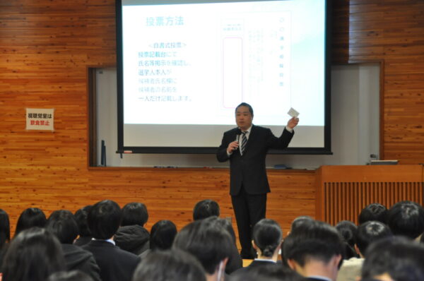 講師に北杜市選挙管理委員会の志村さん(本校OB)をお迎えし、さらに本物の選挙管理委員さん