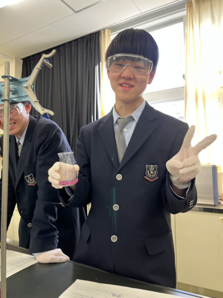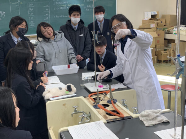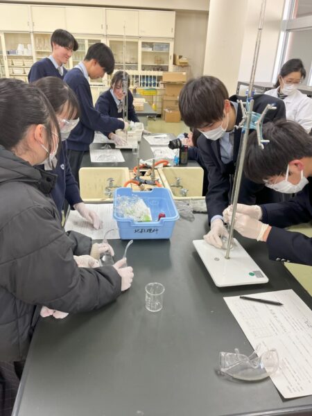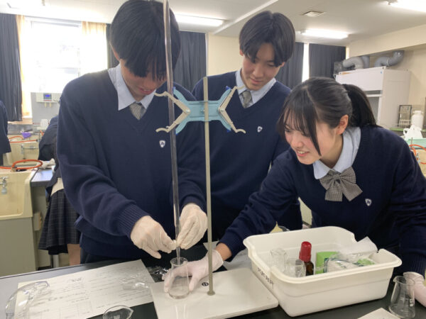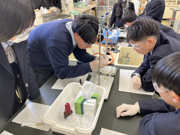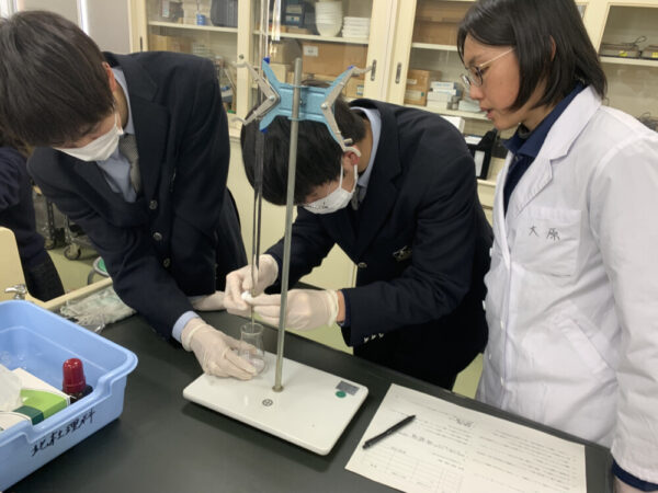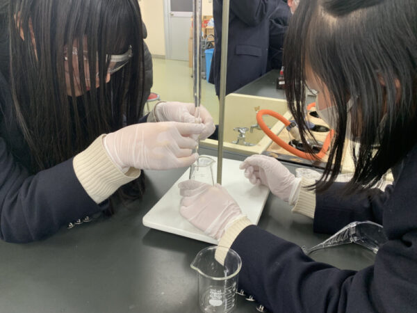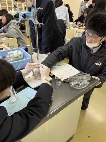 山梨県立北杜高等学校 > 教育活動 > 2月26日(水) 化学基礎の中和滴定実験(2年普通科) 2025年3月3日カテゴリー: 教育活動 2月26日(水) 化学基礎の中和滴定実験(2年普通科) 酸と塩基の学習で、中和滴定実験を行いました。 普段家庭で使っている食酢には、どのくらいの酢酸が入っているのか?を実験によって導き出そうというものです。 食酢(酸)を10倍に薄め、フェノールフタレイン溶液を入れます。 そこへ濃度の分かっている水酸化ナトリウム水溶液(塩基)を滴下します。 はじめは透明ですが、一滴垂らすごとにピンク色になり、振るとまた透明になります。 その様子に生徒たちは興味を持っていた様子でした。 酸と塩基がちょうど同じ量になった点((薄いピンク色)で終わり、残った塩基の量を読み取ります。 その点が難しかったようでした。 1人1回ずつ実験操作を行い、班の平均を出した値から物質量と質量を計算しました。 食酢の食品成分表に近い値が算出されました。 座学での学びと実験が結びつくことで、より深い学びをしていきたいです。