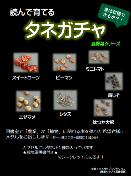 山梨県立北杜高等学校 > 学校から > 「読んで育てる タネガチャ」展示中 2025年5月30日カテゴリー: 学校から 「読んで育てる タネガチャ」展示中 図書館では「読んで育てる タネガチャ」を開催しています。 期間中、「農業」あるいは「植物」に関する本を借りた人は、ガチャガチャに挑戦できます。 カプセルの中には、夏野菜のタネと、農業クラブ有志による手作りの栽培説明書が入っています。 ガチャガチャに挑戦した生徒たちは、狙っていたタネが当たると歓声をあげていました。