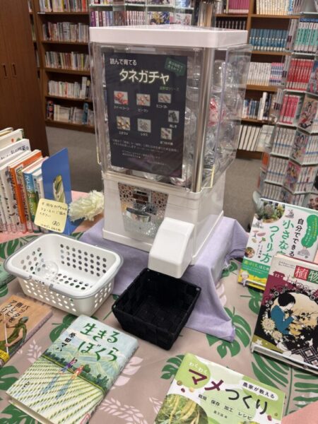 図書館では「読んで育てる タネガチャ」を開催しています。
