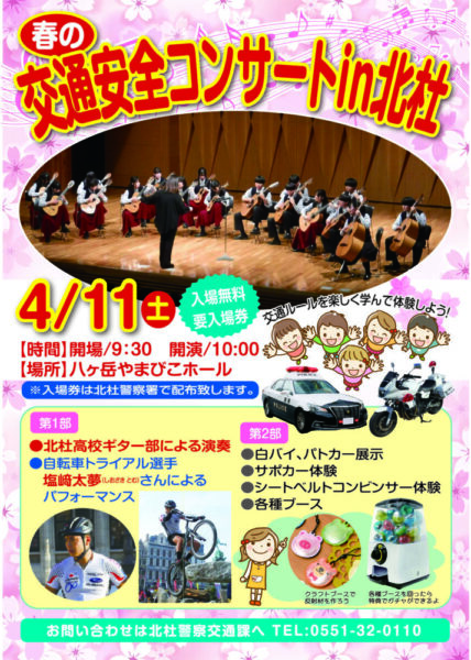 4月11日(土)に交通安全コンサートを、八ヶ岳やまびこホールにて開催します。