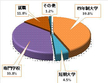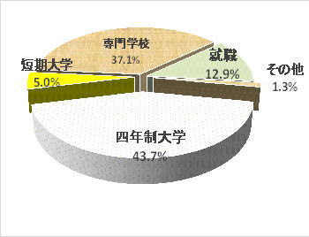 山梨県立北杜高等学校 > 進路状況(進学・就職) 進路状況(進学・就職) 令和6年度卒業生の進路決定状況(2025/3/13現在) 総合学科 普通科 合 計 国立大学 1人 1.3% 2人 3.8% 3人 2.3% 公立大学 0人 0.0% 13人 22.6% 13人 9.0% 私立大学 14人 17.5% 37人 45.3% 51人 28.6% 短期大学 5人 6.3% 1人 1.9% 6人 4.5% 専門学校 37人 41.3% 16人 22.6% 53人 33.8% 就 職 27人 31.4% 2人 2.7% 29人 18.1% その他 2人 2.3% 3人 4.1% 5人 3.1% 合 計 86人 74人 160人 令和6年度進路決定状況 2025/3/13現在 大学 山梨大学(2)、群馬大学、都留文科大学(4)、公立諏訪東京理科大(2)、山梨県立大学(6)、熊本県立大学 法政大学、明海大学、明治大学、東京工科大学、日本大学、淑徳大学、専修大学(2)、武蔵野大学、國學院大學、常葉大学、駒澤大学(2)、京都産業大学、東海大学(2)、明星大学(2)、帝京大学、日本医療科学大学、拓殖大学、日本獣医生命大学、神奈川大学(2)、金沢学院大学、東京農業大学(3)、摂南大学、東京経済大学(2)、帝京科学大学(2)、立正大学、岡山理科大学、大東文化大学(2)、松本大学(2)、関東学院大学(2)、山梨学院大学(11)、杏林大学、山梨英和大学(4)、玉川大学、城西大学 短期大学 山梨学院短期大学(4)、大月短期大学、創価女子短期大学 専門学校 甲府看護専門学校(7)、エプソン情報科学専門学校、サンテクノカレッジ(6)、バンタンクリエーターアカデミー、大原医療保育スポーツ専門学校甲府校(4)、東放学園専門学校、山梨県歯科衛生士専門学校(3)、国際文化美容理容専門学校、帝京山梨看護専門学校(3)、山梨県美容専門学校、辻調理師専門学校(2)、山梨県立宝石美術専門学校、多摩リハビリ専門学校(2)、大原医療保育スポーツ専門学校甲府校(4)、山梨秀峰調理専門学校(2)、帝京福祉専門学校、信州松本動物専門学校(2)、東京美容専門学校、共立高等看護学院(2)、立川こども専門学校、中日美容専門学校、国際新堀劇術専門学校、日本電子専門学校、神戸電子専門学校、JAPANサッカーカレッジ 就職・公務員 キッツ(3)、東京エレクトロンテクノロジーソリューション、セラヴィリゾート泉郷(2)、ユイットラボラトリーズ、瀧口製作所(2)、オキサイド、日本郵便(2)、オギノ、ABC Cooking Studio、桂精機製作所、MA Solutions、菊島、愛の家グループホーム、シーマ電子、ウエルシア薬局、乗馬クラブレイン、内田孔建設、昭和産業、追分ファーム、四谷建設、ファナックパートロニクス、北東技研工業、星野リゾートマネジメント